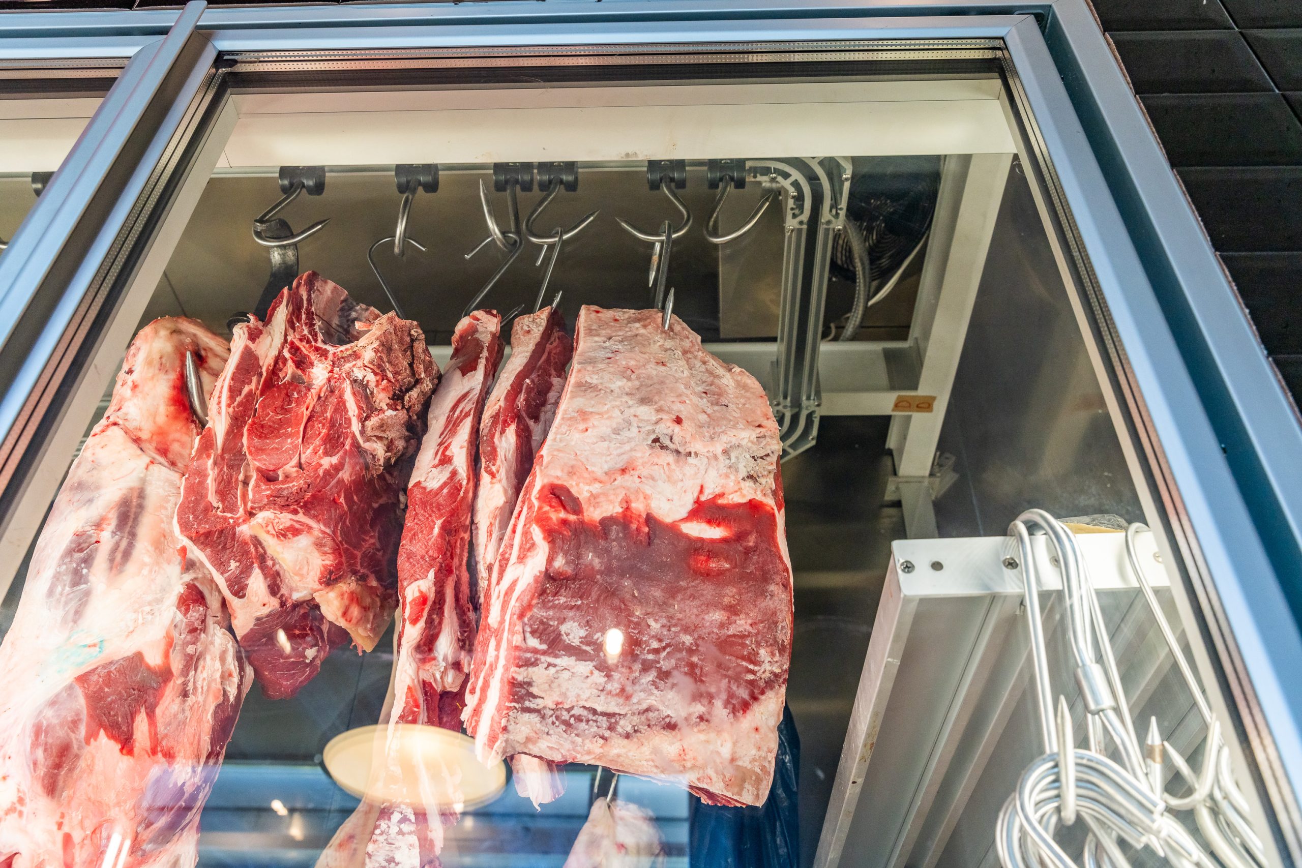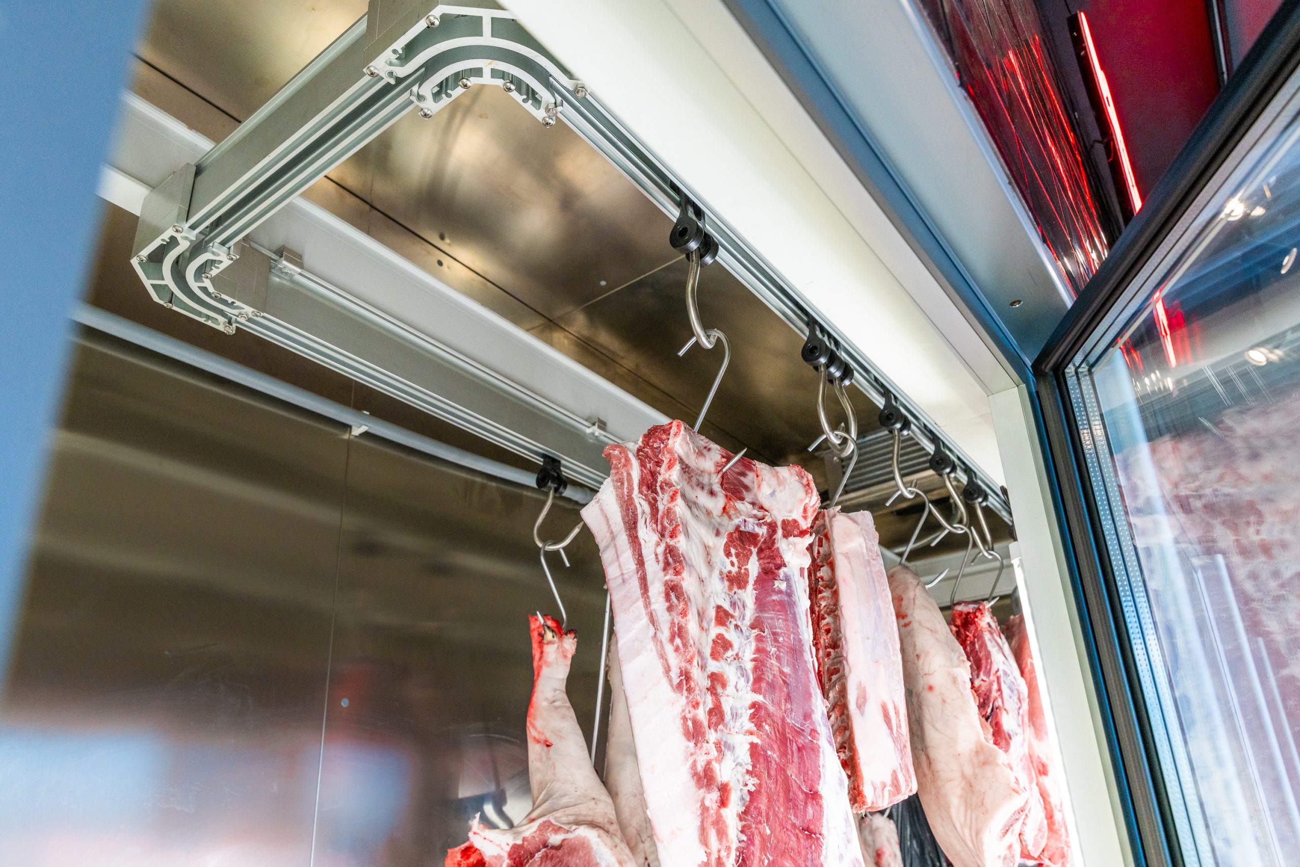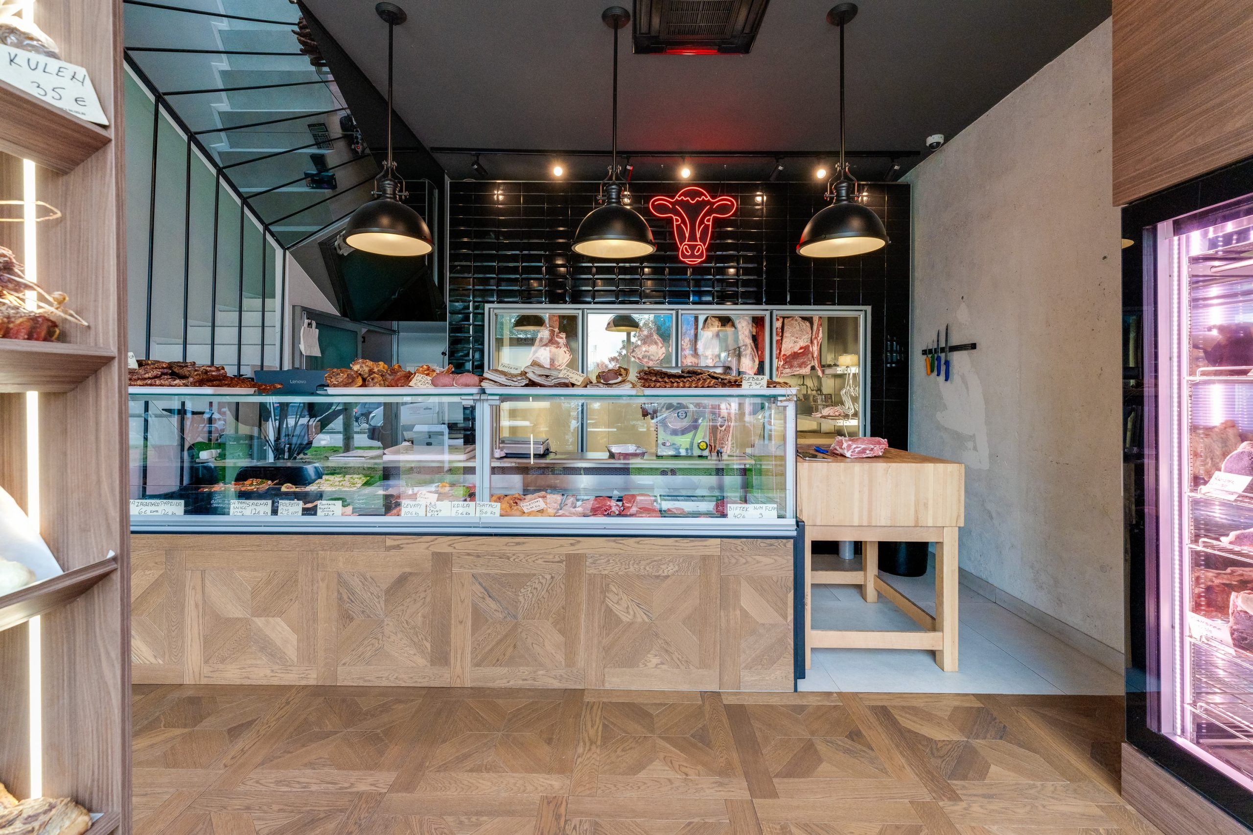 Dizajn, idejno rješenje za mesnicu, oprema za mesnicu, rashladna vitrina i komora za meso, uređaji za pripremu mesa s jedinstvenom koncepcijom rashladne komore koja ima funkciju izložbene komore s prednje strane sva ostakljena. Rashladna komora može primiti veću količinu mesa s uređajem koji je tehnički koncipiran da ne suši meso i održava temperaturu na 0 + 2 °C, ugrađen glajz (transporter) s kliznim kukama na kotačima koje s lakoćom kruže po cijeloj komori, čime se postiže brzina postavljanja izabranog mesa s prednje strane i ostavlja dovoljno mjesta za skladištenje ostalih dijelova mesa sa stražnje strane komore. Kotači glajza s pokretnim kukama se nalaze unutar ALU profila čime se postižu maksimalni higijenski zahtjevi a komadi mesa se neovisno o težini i veličini s lakoćom premiještaju unutar hladne komore. Kvalitetna i višeg ranga rashladna izložbena vitrina talijanske proizvodnje za temperaturni režim mesa 0 + 2 °C, blagom ali ravnomjernom i stabilnom cirkulacijom zraka omogućava pravilno održavanje mesa bez sušenja, moderna ravna stakla s hidrauličnim cilindrima za podizanje prema gore, rasvjeta s posebnom nijansom rosa-crvene koja ističe prirodnost, svježinu i boju mesa, komora u vetrini ispod izložbenog prostora za dodatno skladištenje mesa. Rashladna izložbena vitrina s posebnim sustavom za odležavanje mesa (DRY AGE BEEF) omogućava kontrolu vlage i temperature te održavanje stabilne kiselosti 5.4 – 7.0 (Ph vrijednost). Stroj za izradu ćevapa i burgera (pljeskavica) s kapacitetom od 100 kg/h omogućava dodatno povećanje kapaciteta ove mesnice. Na stroju se kalup po potrebi brzo mijenja, može proizvoditi razne forme burgera (pljeskavice) i razne dužine ćevapa. Na jednostavan način se podešava željena težina, prednost stroja je velika preciznost, zauzima malo mjesta na stolu, lako je na kraju rada izvaditi i oprati dijelove.