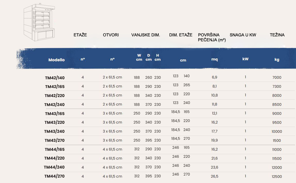 Pekarska parna etažna peć za kruh i peciva s retarderom i komorom za lievitaciju. Prilikom pečenja kruha u većim pećima nudimo automatizirani sistem integriran za ubacivanje i vađenje kruha koji znatno olakšava rad u proizvodnji kruha. Serija parnih cijevnih peći dizajnirana je s vatrostalnim zidovima i klasičnim prstenastim parnim cijevima